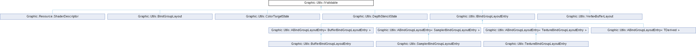 Implemented in Graphic::Resource::ShaderDescriptor, Graphic::Utils::ABindGroupLayoutEntry< TDerived >, Graphic::Utils::ABindGroupLayoutEntry< BufferBindGroupLayoutEntry >, Graphic::Utils::ABindGroupLayoutEntry< SamplerBindGroupLayoutEntry >, Graphic::Utils::ABindGroupLayoutEntry< TextureBindGroupLayoutEntry >, Graphic::Utils::BindGroupLayout, Graphic::Utils::BufferBindGroupLayoutEntry, Graphic::Utils::ColorTargetState, Graphic::Utils::DepthStencilState, Graphic::Utils::SamplerBindGroupLayoutEntry, Graphic::Utils::TextureBindGroupLayoutEntry, and Graphic::Utils::VertexBufferLayout.